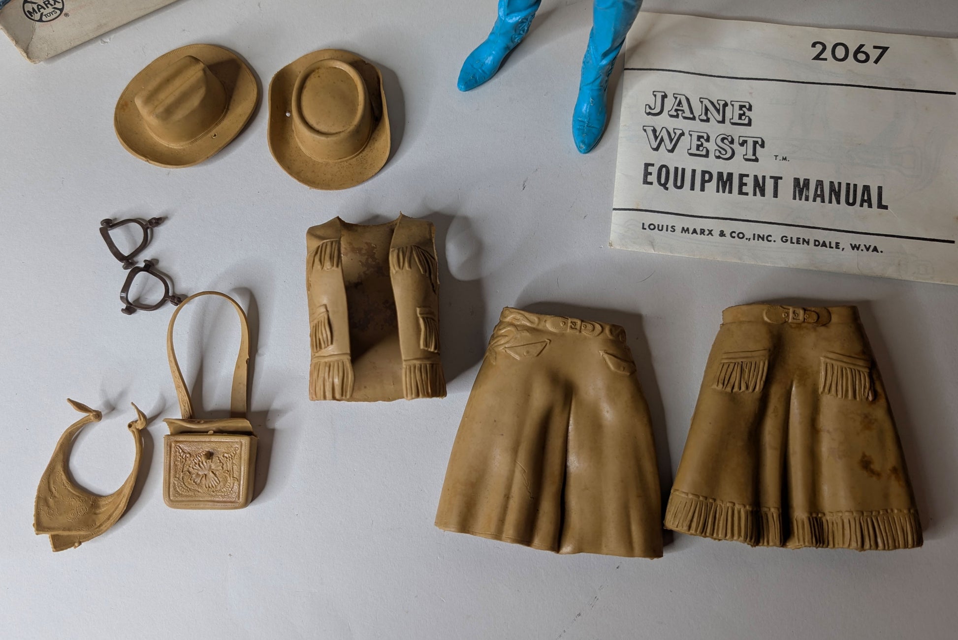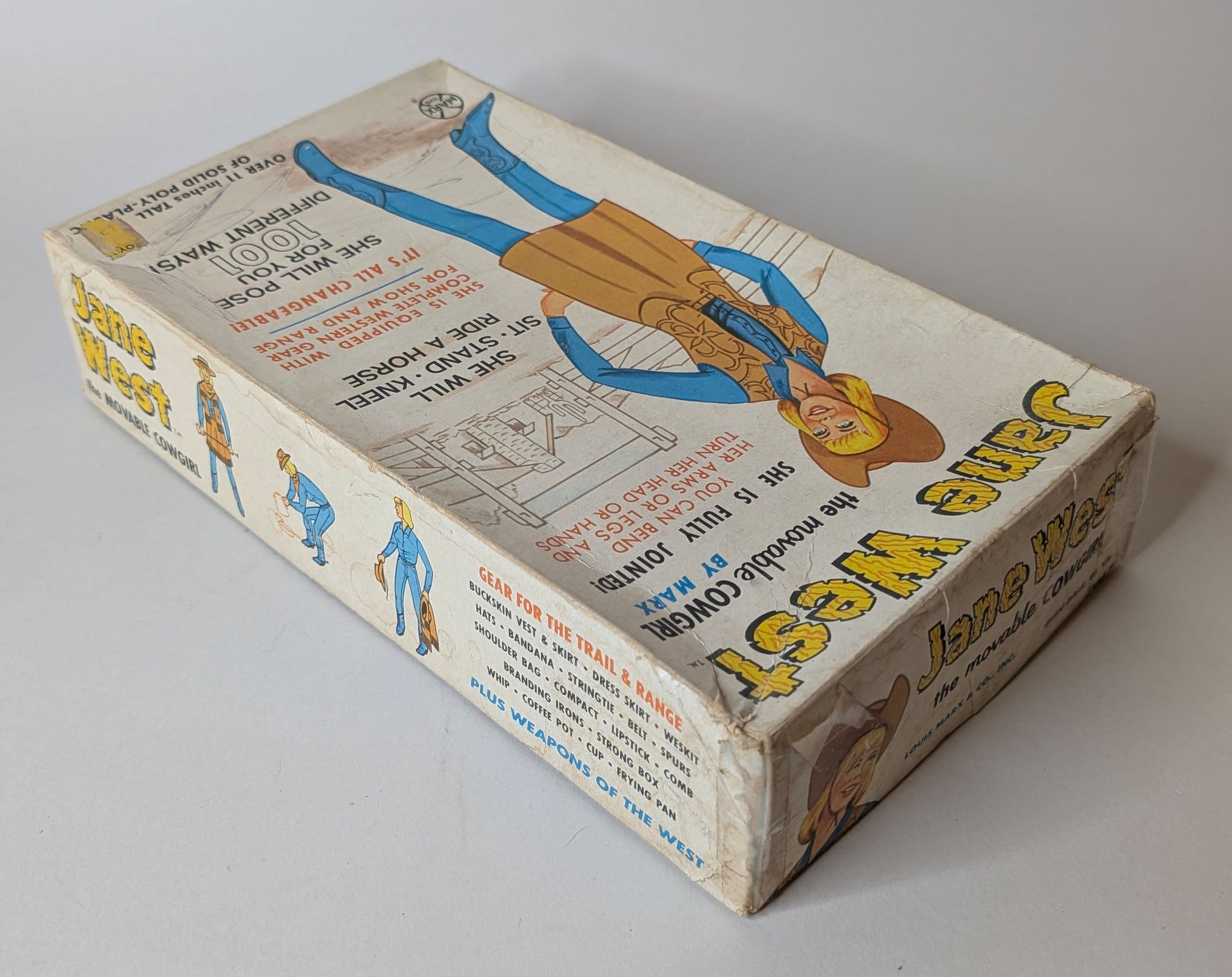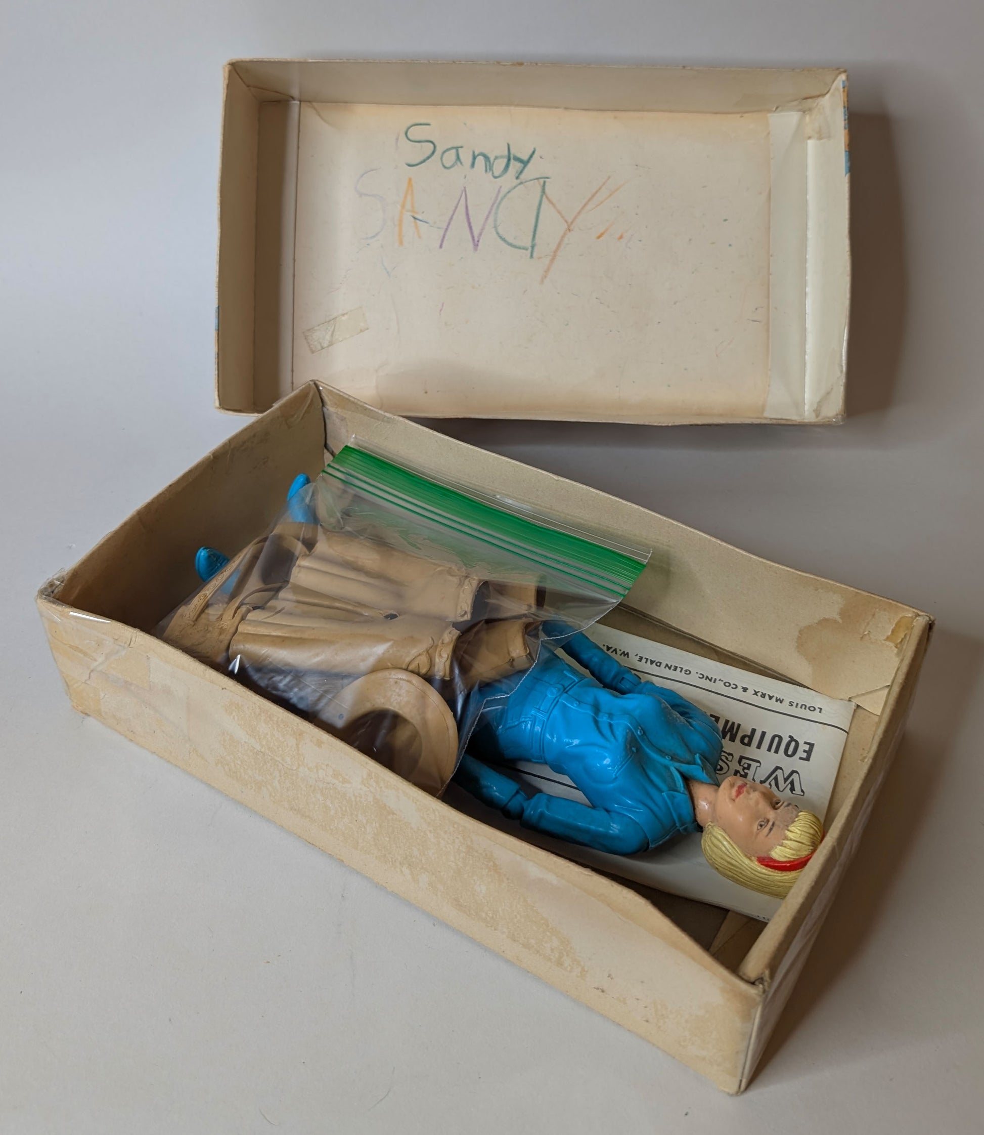 Very Good Condition: Date Stamped 1965, Few Body Rubs/Scratches, Few Hair Rubs, Clevis Pin Shoulders, Clevis Pin Left Hip, Clevis Pin Right Hip, Good Springs, Good Rivet Paint ,Great Jane at a fantastic price. Box is C5 with tape and water stains. Accessories pictured. Overall, this set needs a good clean to make it SHINE! Previous owner even signed it!