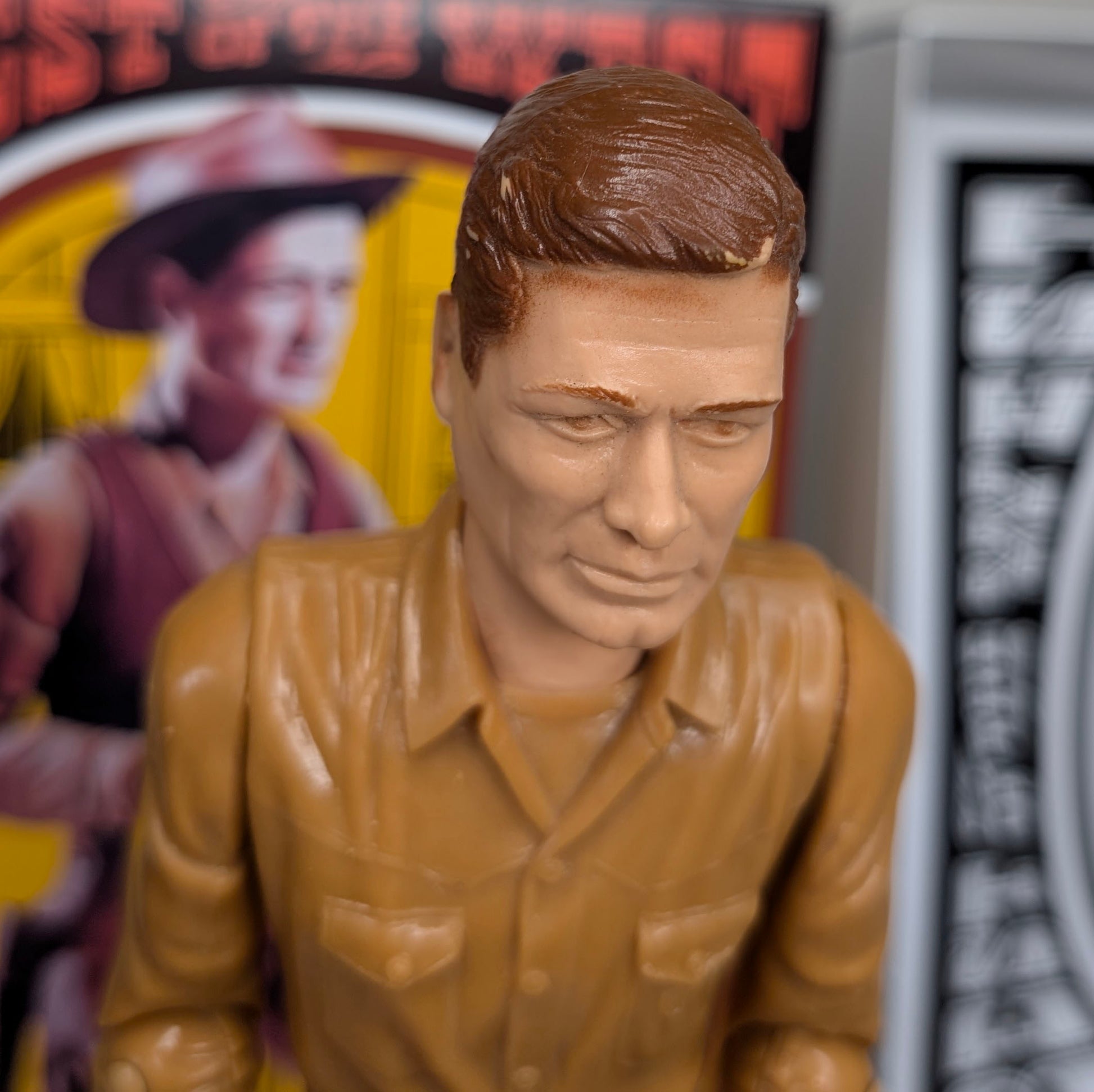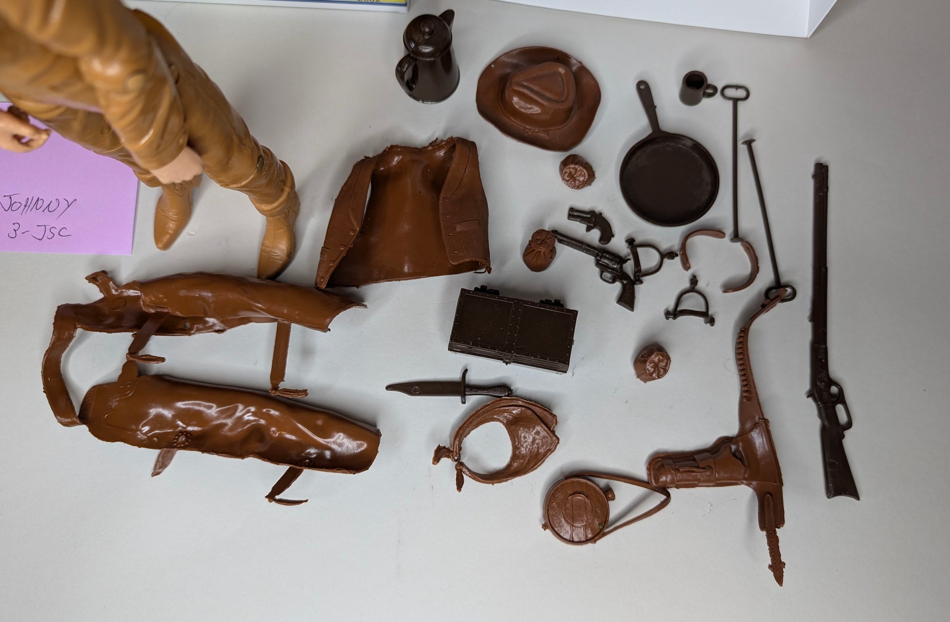 C8+ Condition: Date Stamped 1973, 2nd edition body. Few Body Rubs/Scratches, , Few Hair Rubs, Clevis Pin Shoulders and Hips, Clean Springs, Nice Rivet Paint, Hard to find Johnny in Caramel. Comes in a reproduction 4th ed Best of the West series box with matching equipment manual. Complete Accessories are generally in excellent condition. No crayon smell.