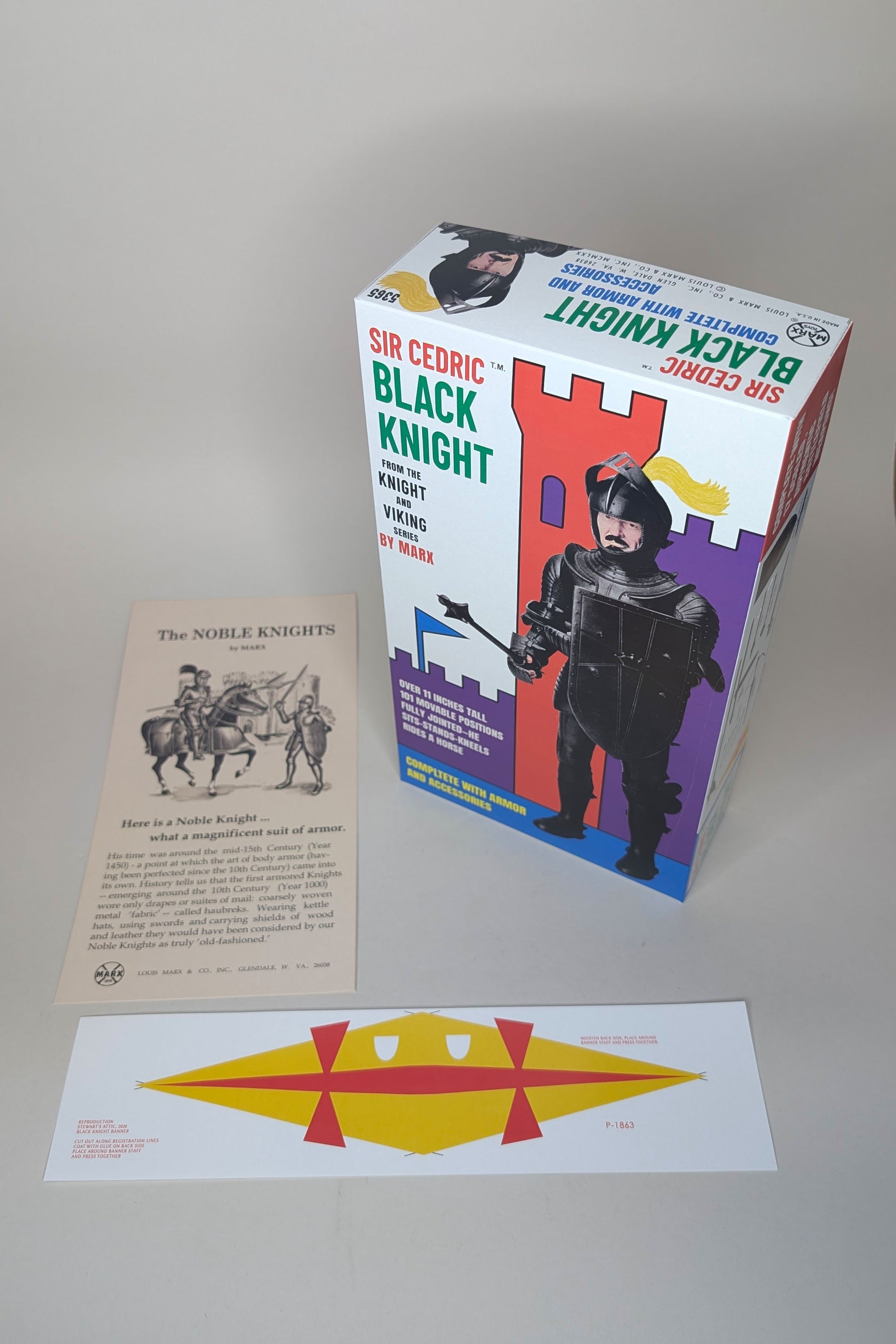 Made in the style of vintage Marx, full color box top with white box bottom. This is a FANTASY box for this knight based on the US 2nd Issue (MOD) boxes. This set also includes a reproduction of the US Noble Knight instruction manual and a custom Banner / Flag banner sheet made exclusively for this knight. Vintage banner sheets were coated with envelope glue on the back. The buyer would cut out the banner and wet the back and then wrap around the provided wooden stick. This banner is made with the same paper but is uncoated.