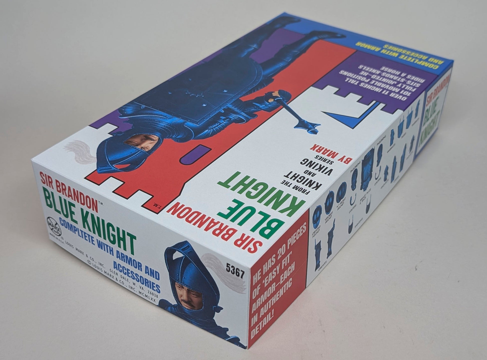 Made in the style of vintage Marx, full color box top with white box bottom. This is a FANTASY box for this knight based on the US 2nd Issue (MOD) boxes. This set also includes a reproduction of the US Noble Knight instruction manual and a custom Banner / Flag banner sheet made exclusively for this knight. Vintage banner sheets were coated with envelope glue on the back. The buyer would cut out the banner and wet the back and then wrap around the provided wooden stick. This banner is made with the same paper but is uncoated.